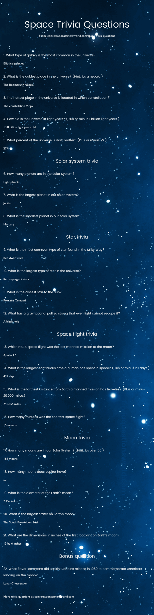 Whether you’re a space enthusiast or just looking for a fun way to spend time with loved ones, these printable space trivia questions are perfect for all ages. Get ready to embark on a journey through the cosmos and discover fascinating facts about our universe.